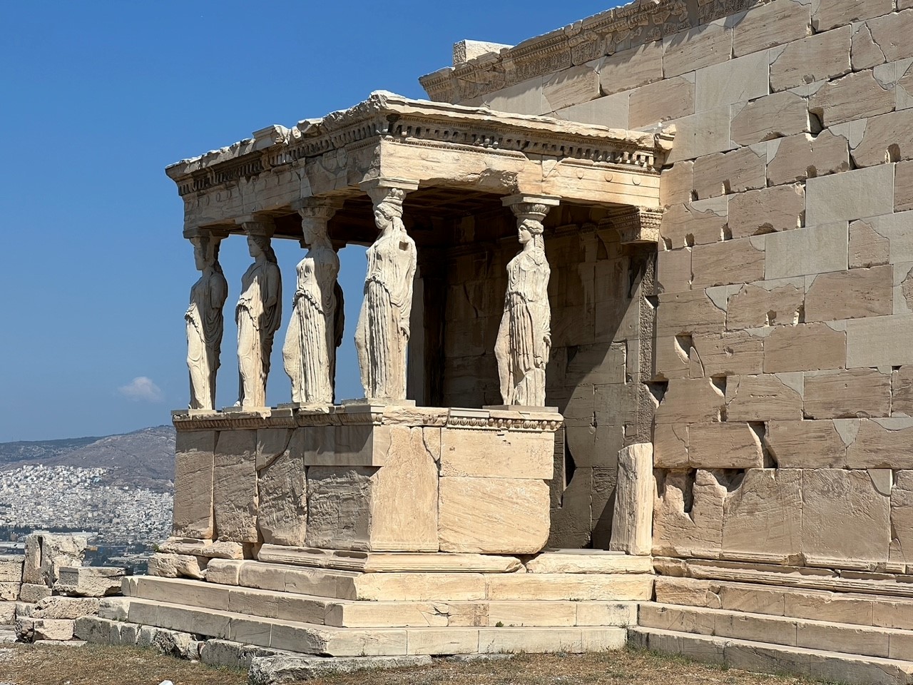 Schließlich begaben wir uns trotz brütender Hitze auf die weltberühmte Akropolis. Dort gibt neben den klassischen Tempeln Frauenfiguren (auch Koren genannt) zu bewundern, deren Originale in dem sehr lohnenden und angenehm klimatisierten Akropolis-Museum zu sehen sind. Sie weisen auf einen alten Streit zwischen Pallas Athene und Poseidon um die Vorherrschaft in Athen hin. Dieser Streit wurde von Pallas Athene gewonnen, weil sie den Athenern einen Olivenbaum schenkte. Jährlich halten die Athener eine Dankprozession für ihre Göttin ab und schenken der Statue ein neues gelbes Kleid.