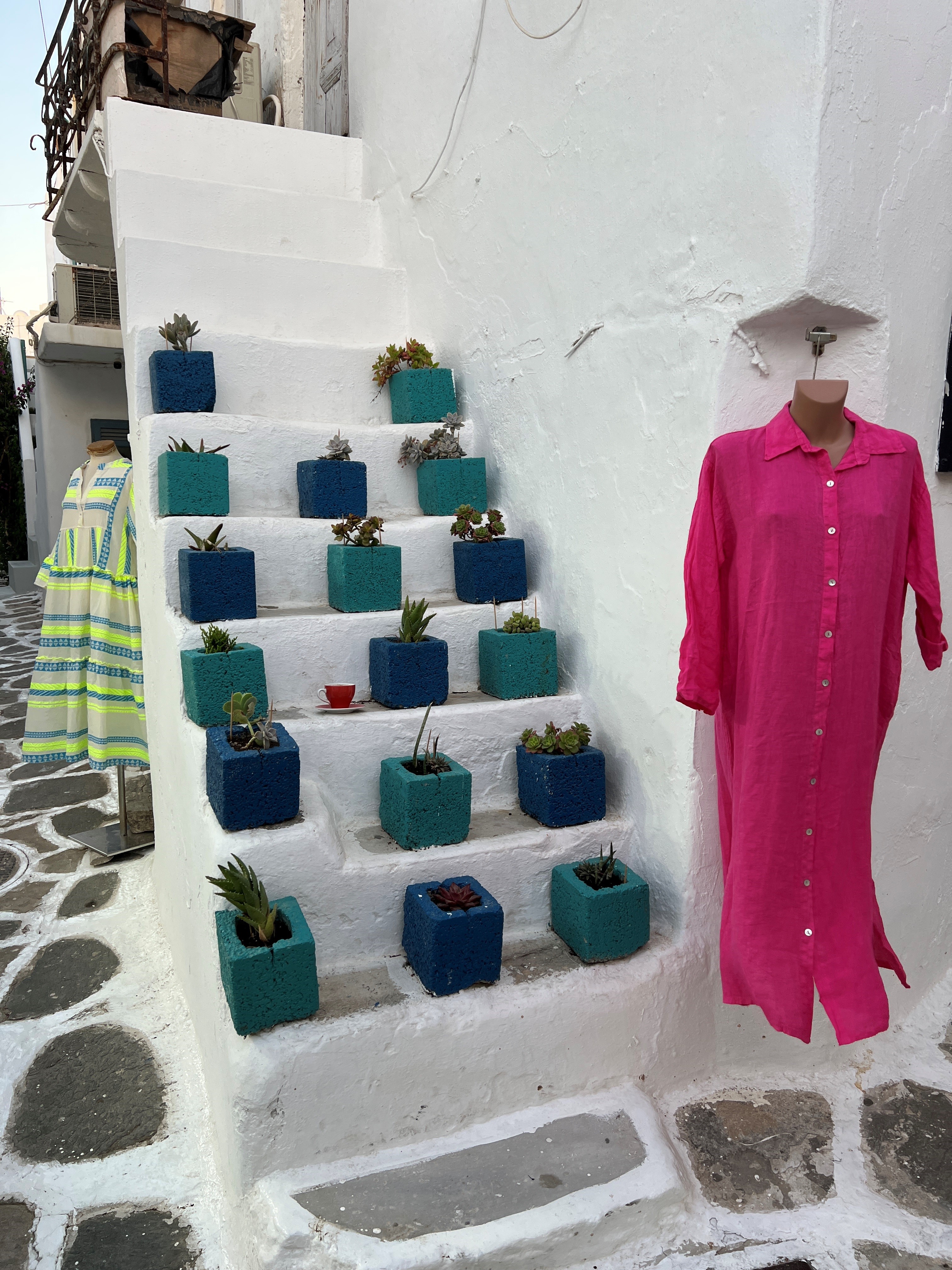 In Parikia, der Inselhauptstadt, gibt es Kirchen und viele Geschäfte, hier eine originelle Treppendekoration einer Boutique.