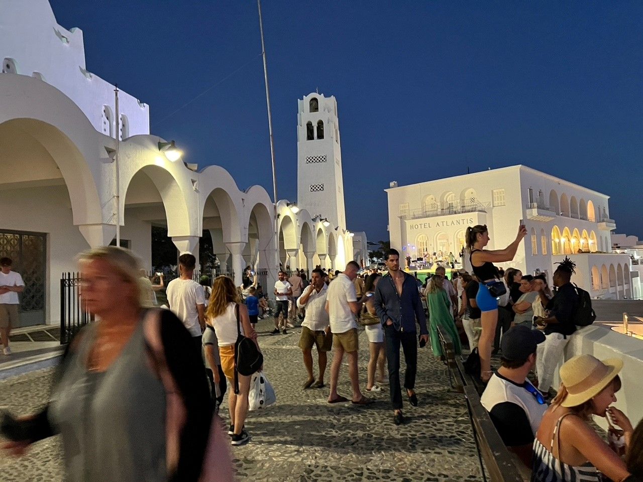 Wieder bringt uns eine Fähre zur nächsten Insel. Diesmal liegt der Hafen weit unterhalb der Städte Fira und Oia, die schon von Weitem als weiße Häuseransammlung vom Schiffsdeck zu sehen sind. Abends auf der Partymeile von Fira ist es supervoll und wenn man Glück hat, sieht man auch ein Hochzeitspaar.
